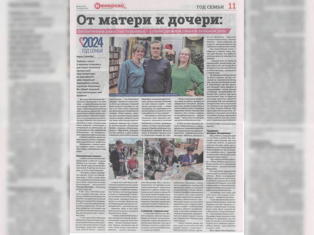 В нашей библиотечной системе в разное время трудилось целых три поколения семейной династии библиотекарей. Родоначальником библиотечной династии Лисовских-Якушевых стала Лисовская Галина Петровна, мама и бабушка Якушевых Светланы и Анны. В начале своей трудовой карьеры Галина Петровна работала в библиотеке села Силино библиотекарем. В 1993 году пришла на работу в библиотеку дочь Галины Петровны – Якушева Светлана Васильевна. Теперь это главный библиотекарь детской библиотеки «Читай-город» МАУК МИБС г. Кемерово. За время работы в библиотеке Светлана Васильевна зарекомендовала себя как человек, стремящийся в полном объеме овладеть тонкостями библиотечной деятельности. Любовь и чуткое отношение к детям, отзывчивость, душевная щедрость, прекрасное знание литературы – всё это личные качества Светланы Васильевны. Она находит общий язык с читателями любого возраста, особенно с детьми и их родителями, активно работает по привлечению новых читателей. Дочь Светланы Васильевны, Анна Игоревна, окончила Кемеровский государственный институт культуры по специальности «Библиотечно-информационная деятельность». С октября 2012 года она работает в детской библиотеке «Читай-город» МАУК МИБС г. Кемерово. Грамотный специалист своего дела, Анна гибко применяет новые технологии. Она руководит работой электронного читального зала. Она также преподает компьютерную грамотность для людей старшего поколения по программам «Университет третьего возраста: старшее поколение в современной информационной среде» и «Статyс: Онлайн». Якушева Анна Игоревна владеет методами приобщения детей к чтению и способами развития их читательских интересов. Детям интересны такие формы работы, как видео- и аудио сопровождение, слайдовые презентации, интерактивные задания. Анна использует творческий подход, привнося в проведение мероприятий интересные моменты командной игры и соперничества. Она проводит массовые мероприятия по краеведению, патриотизму и т. д. Анна – активный участник проекта «Пушкинская карта». Она занимается информированием и привлечением аудитории, создает и проводит мероприятия в рамках проекта. Любовь к книге – главная традиция библиотечной семьи Якушевых-Лисовских, общий трудовой стаж которой 50 лет.