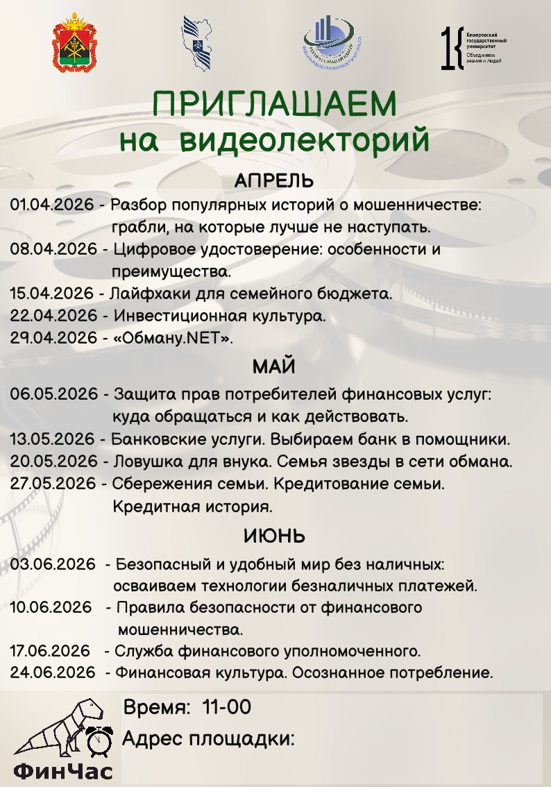 Приглашаем вас на серию бесплатных просветительских встреч в рамках проекта «ФинЧАС». Мы подготовили актуальные лекции, которые помогут уверенно ориентироваться в мире финансов, понимать свои права и безопасно распоряжаться личными средствами.